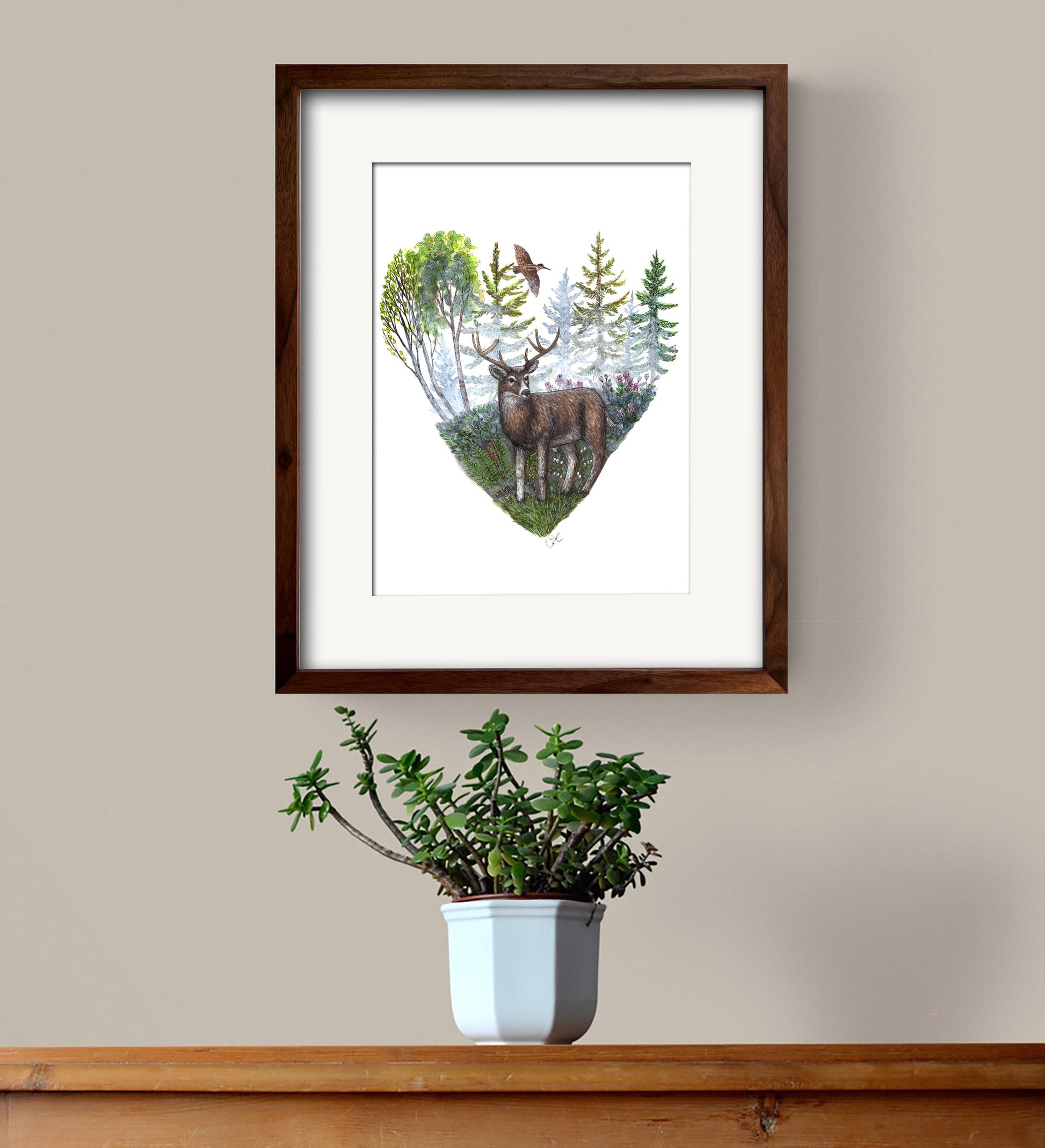 This environment, teeming with life, is a refuge for waterfowl and, more specifically, for white-tailed deer. The deer occupies a central place in this work. The background is divided into two parts: the left side shows the species found in the wooded bogs observed on the site, while the right side contains the flora of the ombrotrophic bogs. The two types of environments come together in a harmonious floral dance representative of the diversity of this wetland complex.