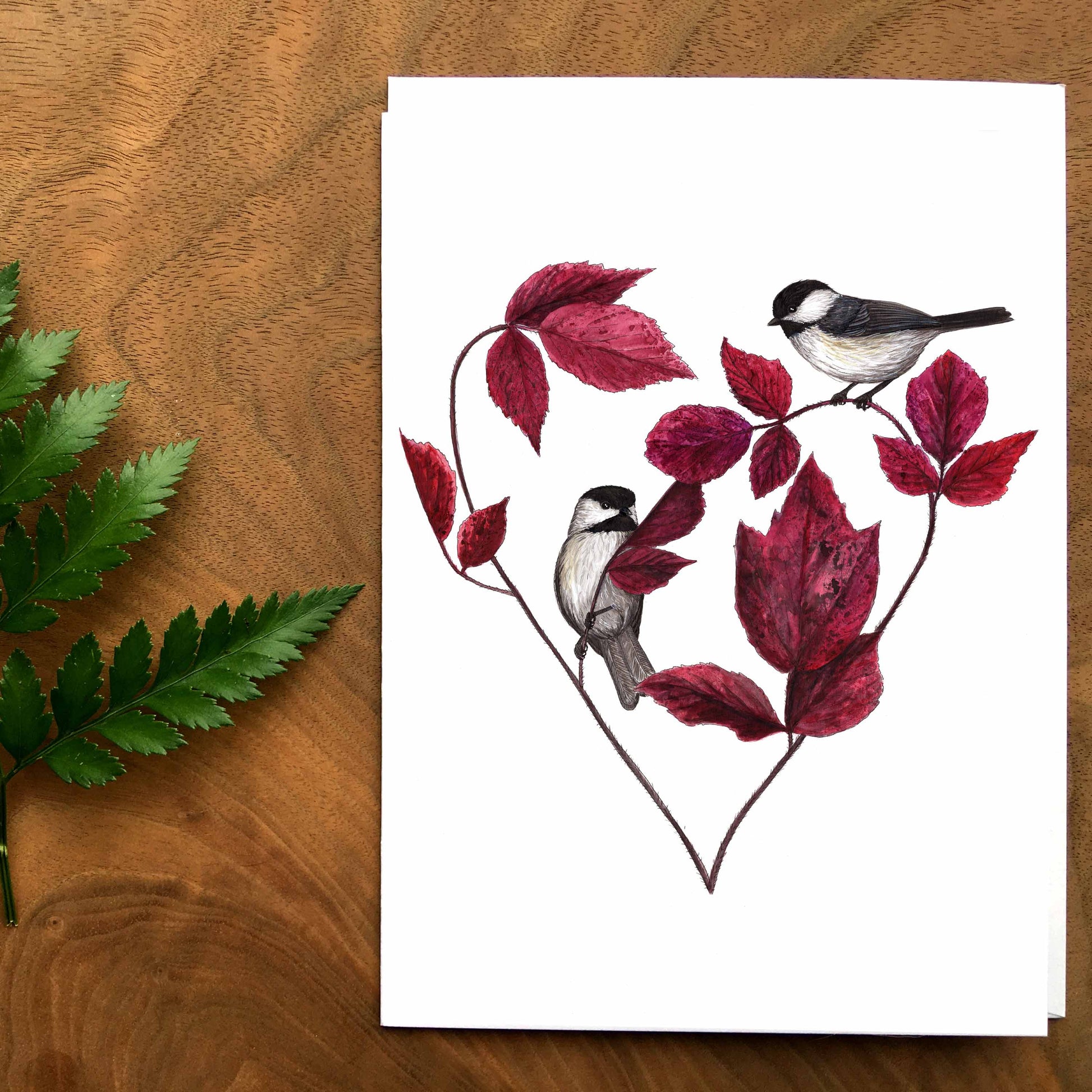 Cette jolie carte de souhaits est une reproduction de mon oeuvre originale ayant pour titre: Les mésanges et le framboisier. Le dessin original dont est tiré cette carte a été réalisé à l'encre et à l'acrylique sur du papier bristol en 2022. Il s'agit d'une impression de haute résolution sur du papier de qualité supérieur sans acide.