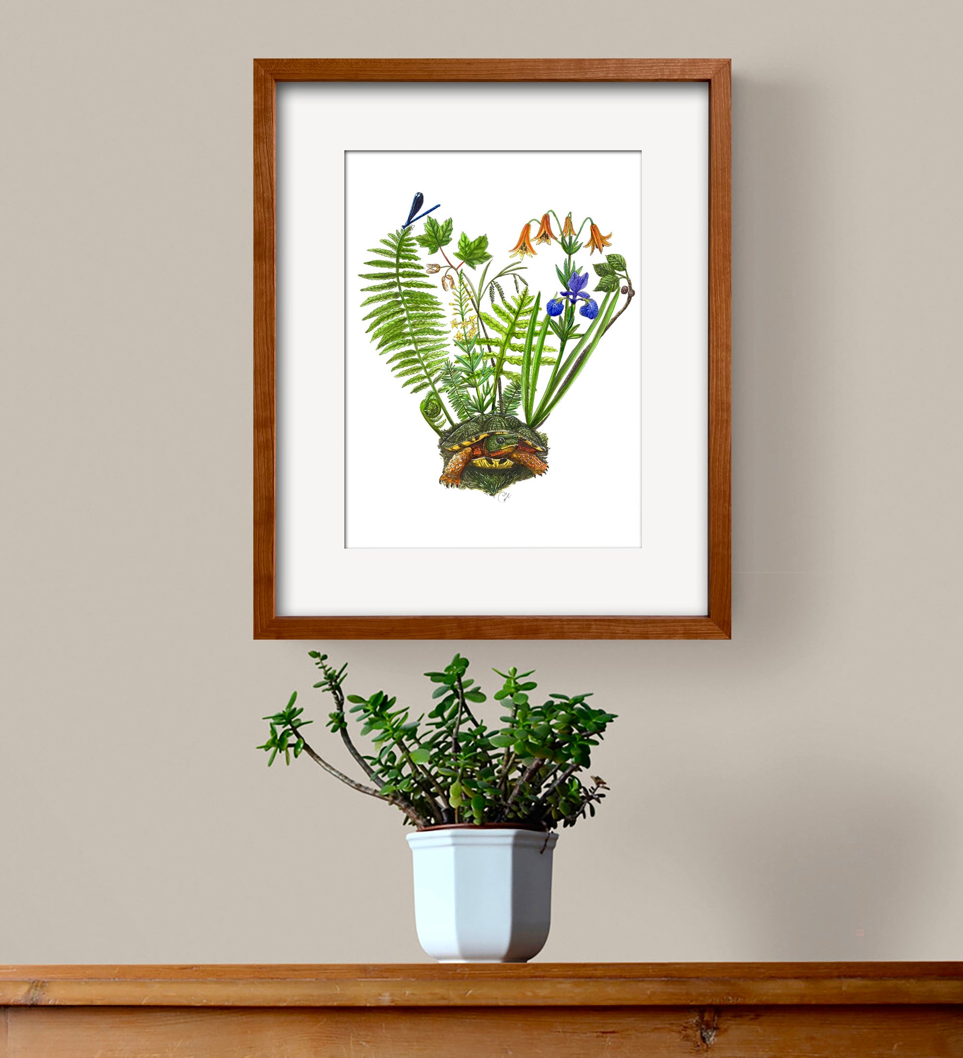 Le marais de Saint-Théodore-d'Acton se présente dans toute sa splendeur. Ce milieu de vie riche et vaste héberge une espèce des plus précieuses. La tortue des bois, reptile à statut vulnérable, y a élu domicile au cœur de ses aulnaies. Les plantes de milieux humides observées pendant ma visite sont également à l'honneur dans cette œuvre. Ce milieu regorge également d'une grande diversité de gibier qui fait le bonheur des chasseurs!