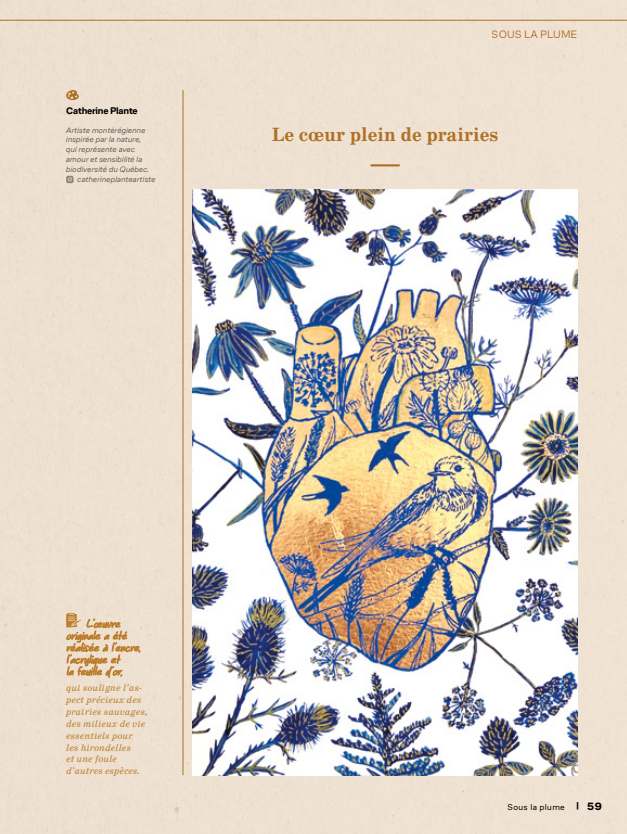 Ma collaboration avec cet organisme dure depuis plusieurs années. Plusieurs de mes produits dérivés sont disponibles sur leur site. En achetant là, une partie des profits est remis à l'organisme. Mon œuvre Le cœur plein de prairies a paru dans la section Sous la plume du magazine de QuébecOiseaux paru en août 2025. De plus, en 2025, cinq de mes Icônes naturelles ont été créées pour eux. En effet, elles ont été remises lors de leur AGA aux récipiendaires des Prix du bénévolat QuébecOiseaux. Finalement, vous pouvez vous procurer une de mes œuvres lors de leur encan annuelle. Tous les fonds recueillis vont à l'organisme.