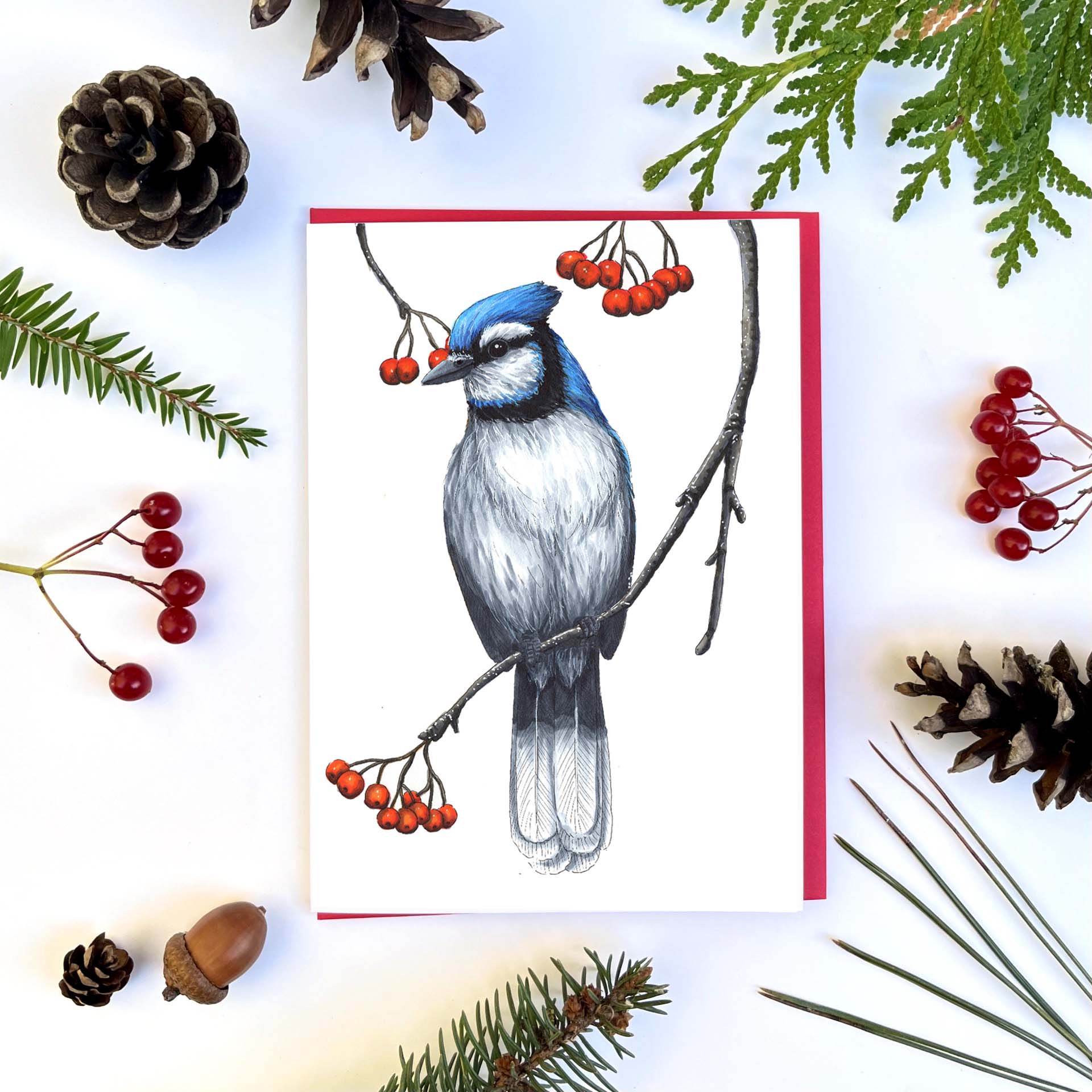 Cette jolie carte de souhaits représente un joli Geai bleu posé sur une branche de Sorbier d'Amérique. Il s'agit d'une impression de haute résolution sur du papier de qualité supérieur sans acide recyclé. Elle est imprimée localement.