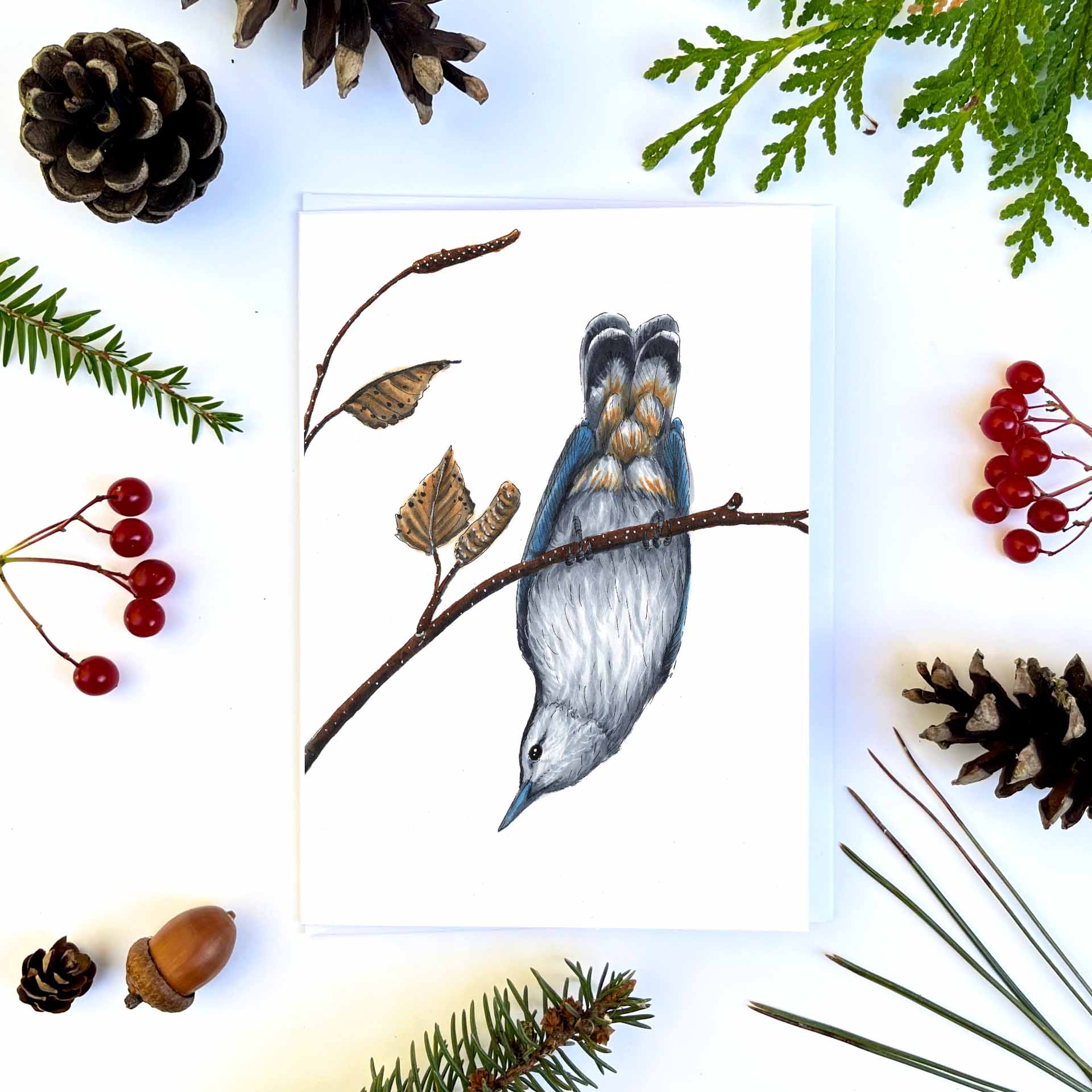 Cette jolie carte de souhaits est nommée: Tu me fais tourner la tête. Elle représenter une belle Sittelle à poitrine blanche se tenant la tête en bas. Il s'agit d'une impression de haute résolution sur du papier de qualité supérieur sans acide recyclé. Elle est imprimée localement.