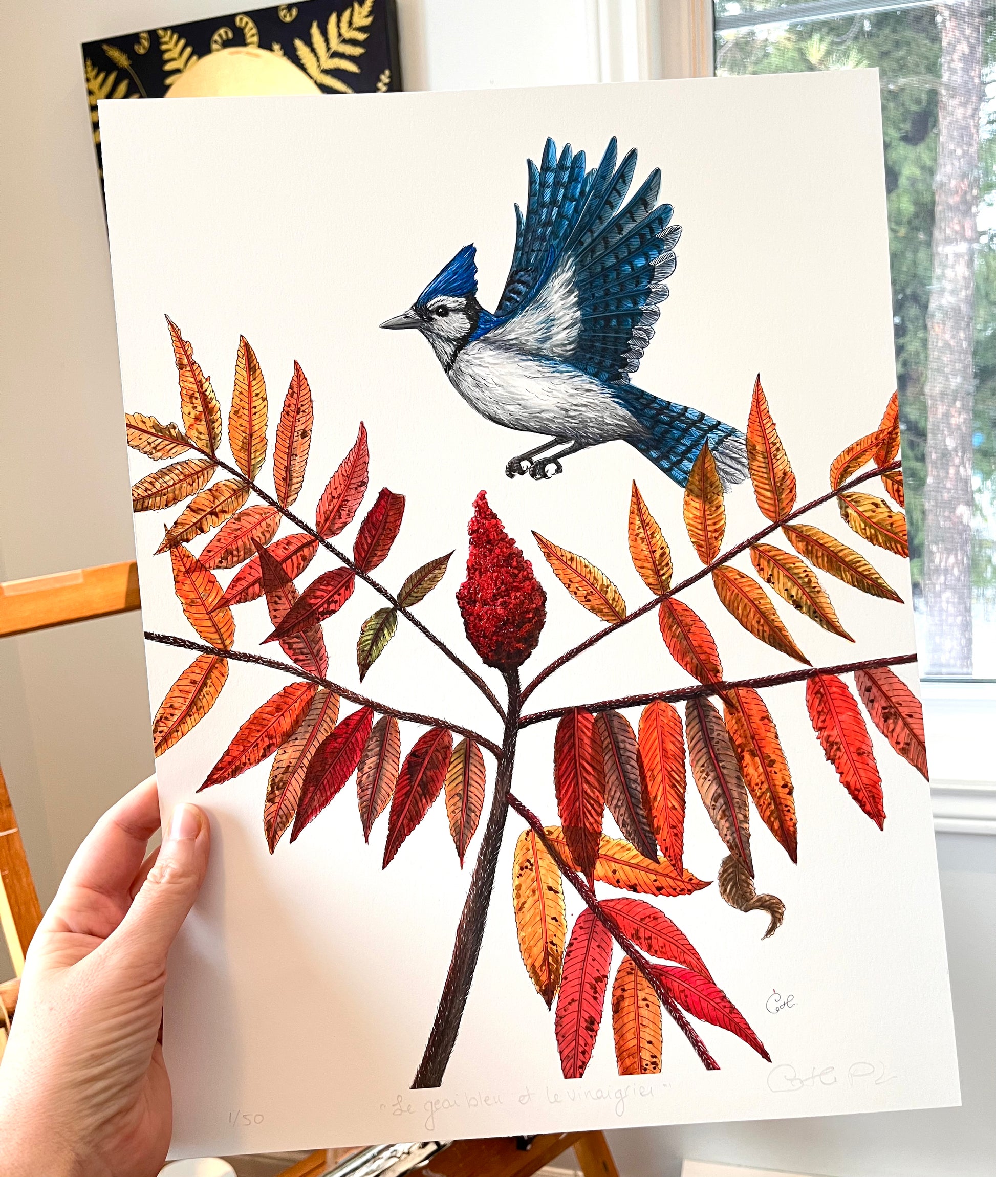 Cette impression d'art (reproduction) est issue de l'œuvre originale nommée: Le geai bleu et le vinaigrier. Cette œuvre a été réalisée en 2024 à l'encre et à l'acrylique sur papier bristol par Catherine Plante artiste. Elle est une ode à l'automne et à ses couleurs! Dans cette œuvre on retrouve un magnifique Geai bleu qui s'apprête à se percher sur une branche de vinaigrier en fruit. Les feuilles de cet arbre ont revêtu des teintes flamboyantes automnales. La texture dans les feuilles a été obtenue en pressant les feuilles (enduites d'encres) sur le papier. J'ai ainsi obtenu des effets de nervures très réalistes.