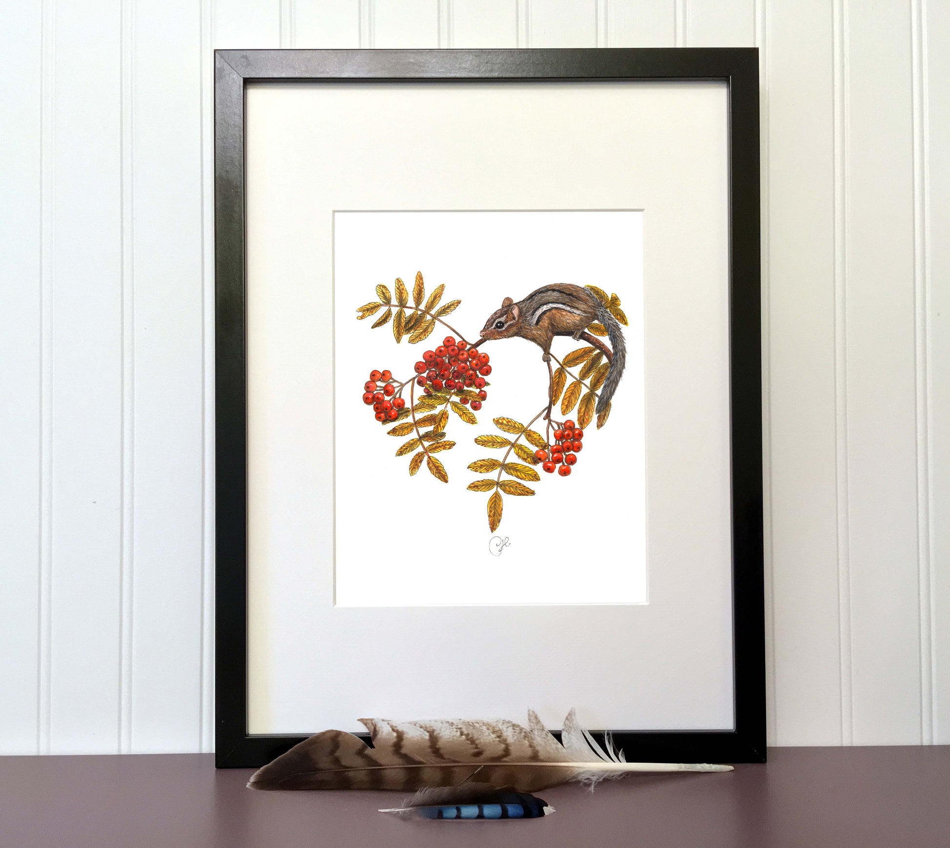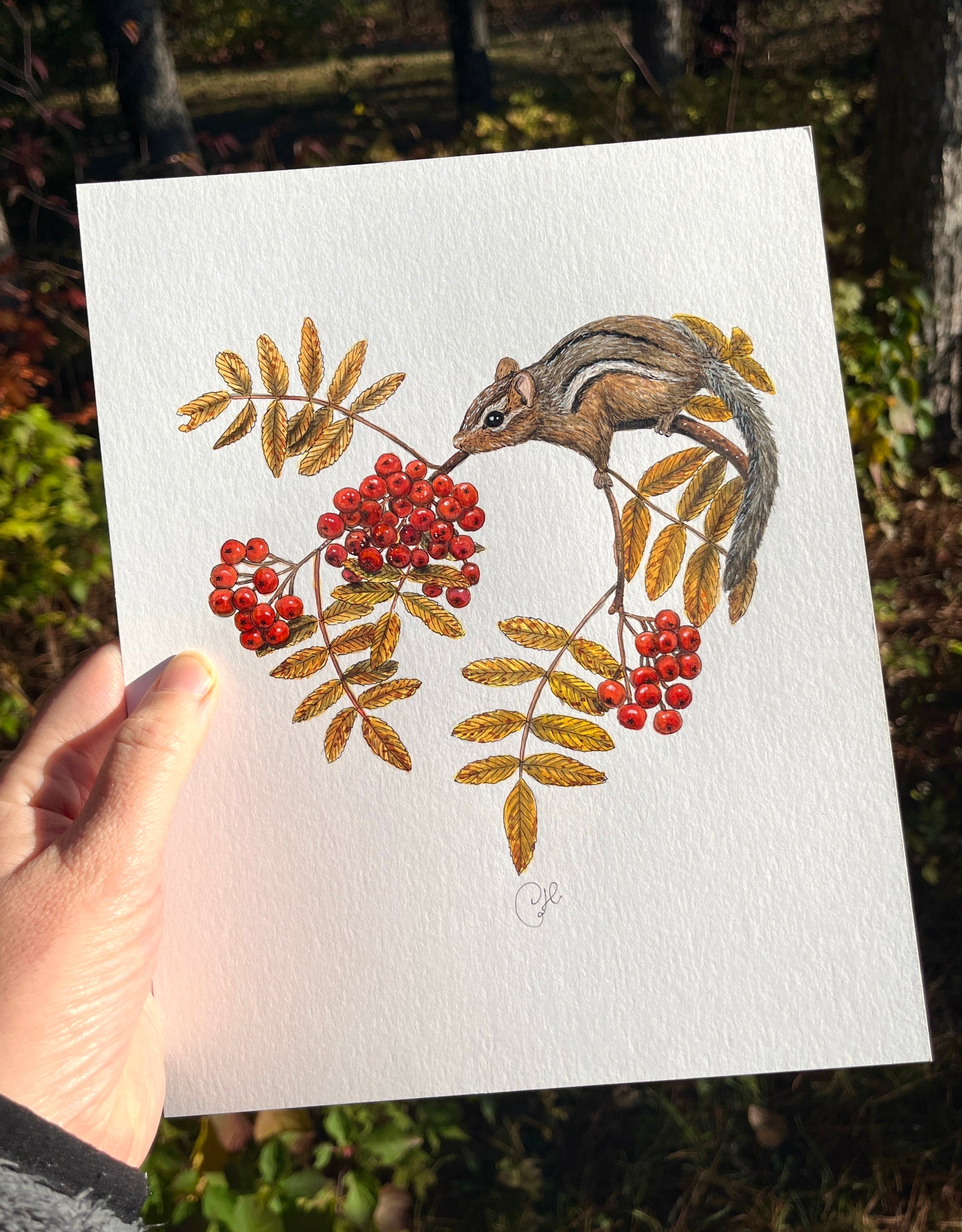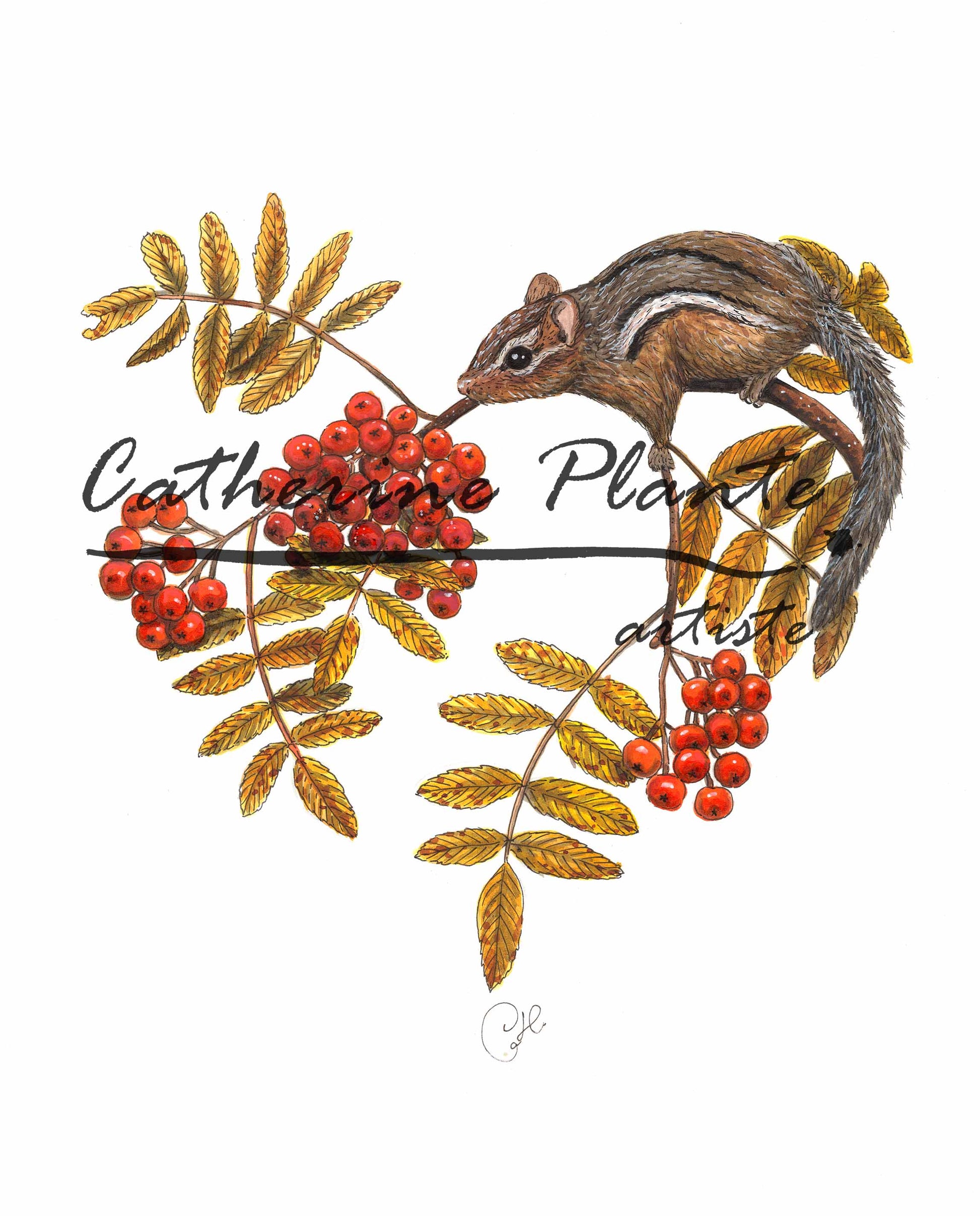 Cette impression d'art (reproduction) est issue de l'œuvre originale nommée Le tamia au sorbier. Cette oeuvre a été réalisée à l'encre et à l'acrylique sur papier bristol en 2025 par Catherine Plante artiste. Elle représente un beau petit tamia rayé agrippé à des branches de sorbier d'Amérique automnales. J'ai eu la chance de voir une scène similaire à celle-ci au parc Forillon en Gaspésie.