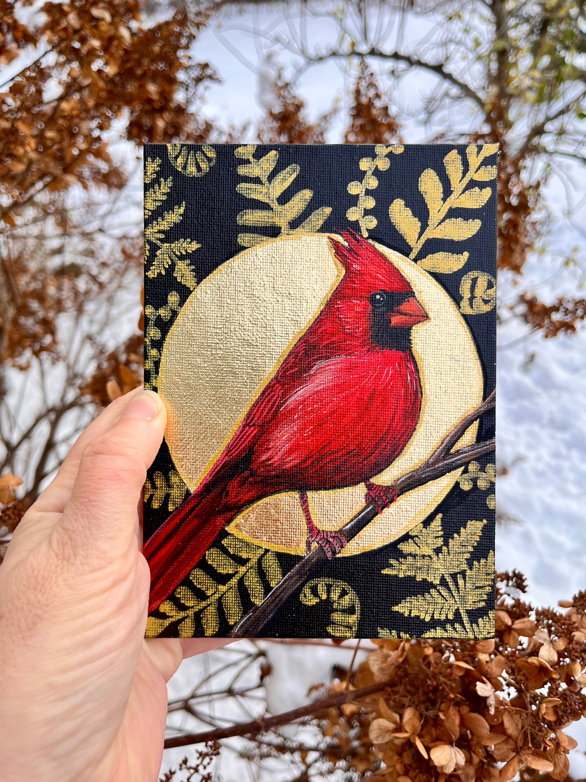 Cette oeuvre se nomme Nos icônes naturelles no18 - Saint-Cardinal. Elle représente un beau Cardinal rouge perché sur une branche et auréolé de feuilles d’or et de silhouettes de fougères. J'ai nommé les oeuvres de cette série « icônes » en référence aux symboles religieux parce que les forêts et les rivières sont mes cathédrales. Pour moi, la nature est ce qu’il y a de plus pure, de plus beau.